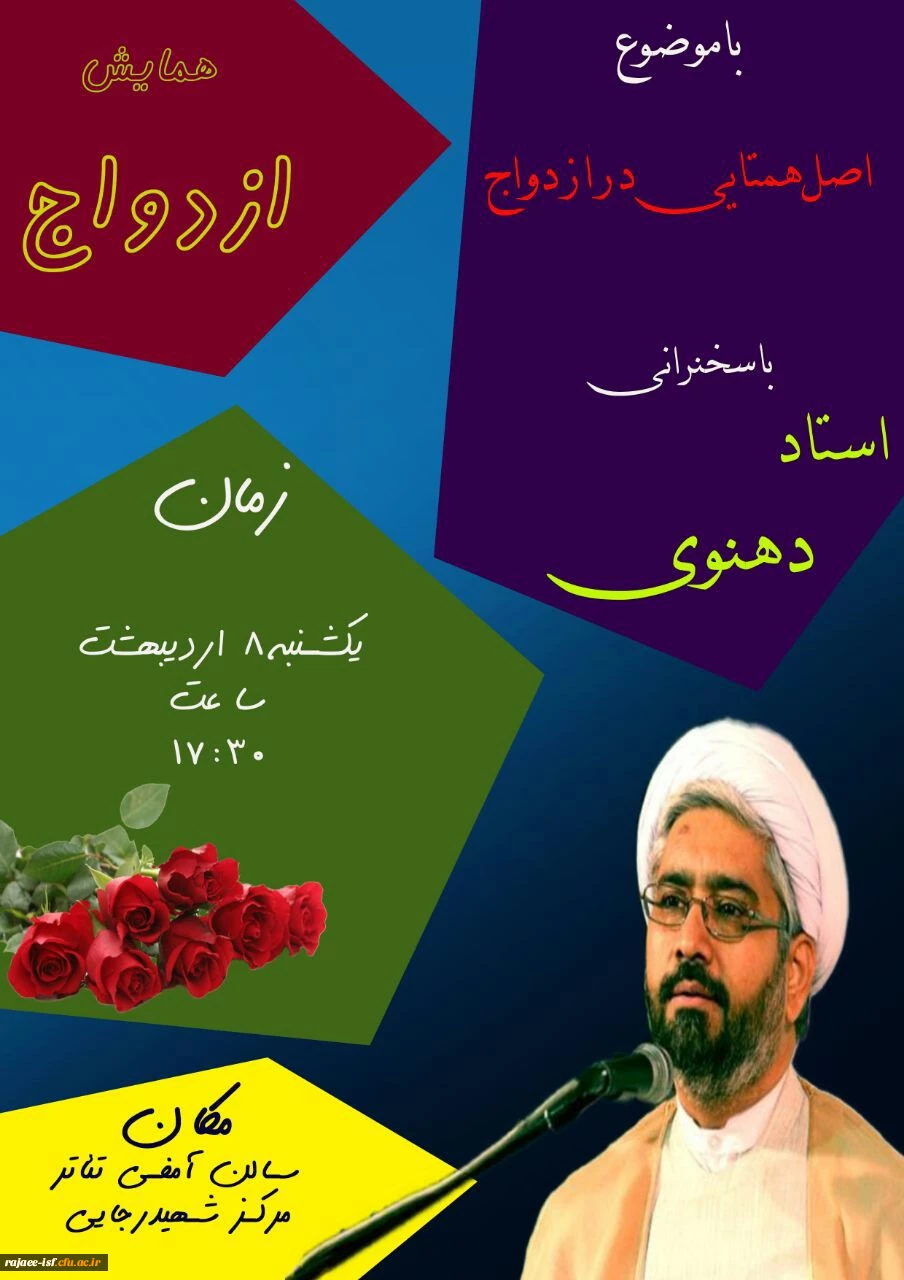 امتیاز دهید : کارگاه اصل همتایی در ازدواج با حضور حجت الاسلام والمسلمین دهنوی شنبه 7 اردیبهشت 1398 ساعت 15:11