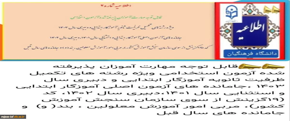 قابل توجه مهارت آموزان پذیرفته شده آزمون استخدامی سری جدید و جا مانده ها این هفته در تاریخ 26 مهرماه کلاسها در مرکز شهید رجایی تشکیل نمی شود و تاریخ برگزاری متعاقبا اعلام می گردد 2