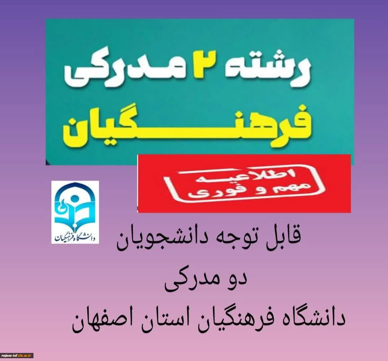 امتیاز دهید : قابل توجه دانشجویان دو مدرکی مرکز دختران شهید رجایی اصفهان 2 شنبه 29 شهریور 1404 ساعت 13:30